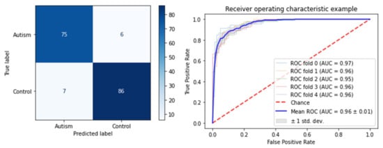 Heinsfeld et al. [] applied a deep learning algorithm combining a multilayer perceptron (MLP) along with autoencoders and obtained 70% mean classification accuracy using connectivity features derived from the Craddock 200 (CC200) brain atlas. However, it took a huge training time (over 32 h). Eslami et al. [] proposed ASD-Diagnet, a framework for detecting ASD using only resting-state fMRI data. A combined learning procedure using an autoencoder and a single-layered perceptron (SLP) was used. Furthermore, to increase the number of training subjects, a data augmentation strategy based on linear interpolation on available feature vectors was implemented. However, this strategy could only improve accuracy by 1% and presented a mean classification accuracy of 70.1%. Tang et al. [] performed ASD and control classification utilizing two types of fMRI imaging modalities. A 3D Resnet and MLP classifier were used in the classification process. This approach obtained 74% classification accuracy.