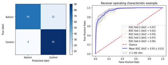 From Table 5, it is evident that AAL atlas represented a fluctuating performance across different models for each scoring metric. The confusion matrix and AUC curve using Model-2 are illustrated in Figure 10.