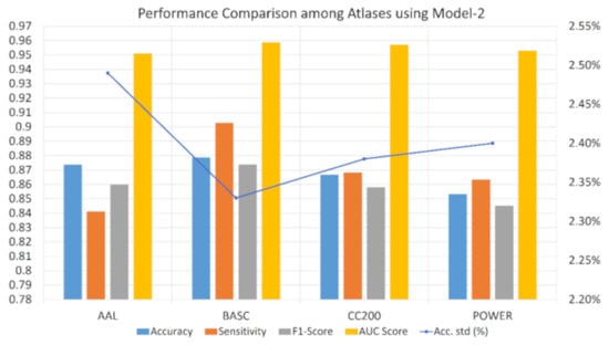 A comparison of all performance metrics across all four atlases is represented in Figure 11 using the proposed Model-2 to determine which atlas had the most discriminative power in identifying autism and control cases.