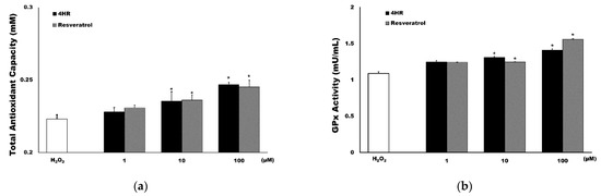 Results of the antioxidant activity assays. (a) Total antioxidant capacity (TAC). 4-Hexylresorcinol (4HR) (black) induced a similar level of TAC production as that of resveratrol (grey). (b) Glutathione peroxidase (GPx) activity. 4HR (black) and resveratrol (grey) significantly increased GPx activity compared to H2O2 only treated control (* p < 0.05 compared to the hydrogen peroxide group, mean ± standard deviation).