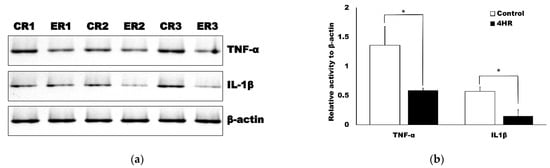 Western blot results for the tissue samples. (a) The samples from the control (ointment base-only group) are represented as CR1, CR2 and CR3, while the samples from the 4HR treatment groups are represented as ER1, ER2 and ER3. Both TNF-α and IL1β expression was significantly higher in the control group compared to the 4HR group. (b) Protein expression was normalized against β-actin and presented in the form of a relative increase in TNF-α and IL1β expression versus the no treatment control and the difference between the groups was statistically significant (* p < 0.05, mean ± standard deviation).
