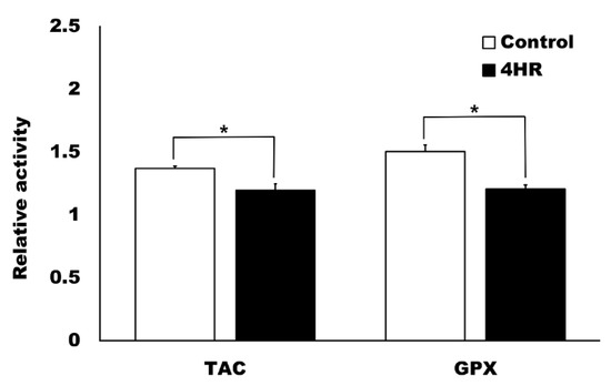 Total antioxidant capacity (TAC) and glutathione peroxidase (GPx) activity in the pulp tissue samples. The control group was administered the ointment base-only. The relative activity of the uninjured incisor pulp was set as 1. The pulp injury increased TAC and GPx activity, while the application of 4HR attenuated the oxidative stress significantly compared to the ointment base-only control group (* p < 0.05, mean ± standard deviation).