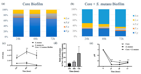 3.1. S. mutans Was Promoted by Core Microbiota and the Core + S. Mutans Biofilm Showed Increased Acidogenic Ability