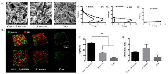 3.2. Core + S. Mutans Biofilm Showed a Net-Like Structure and Increased the Depth of the Biofilms