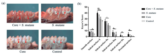 - Keyes, P.H. Dental caries in the molar teeth of rats. II. A method for diagnosing and scoring several types of lesions simultaneously. J. Dent. Res. 1958, 37, 1088–1099. [Google Scholar] [CrossRef] [PubMed]