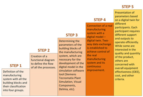 The fifth step focuses on the visualization of the real manufacturing system. Nowadays, visualization is very important for different participants, from operators to management. The presented visualization shows a combination of results from a real manufacturing system enriched with data from the digital twin. A significant advantage is that the digital twin is the same for all participants, only the interpretation of the results is different. There are many studies in the literature that focus on process visualization [26,28], but there is a lack of comprehensive representations of visualization for different participants. This resonates with our reasons we developed the visualization the way we did.