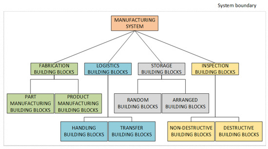 Each discrete manufacturing system (e.g., linear assembly line) consists of various building blocks (e.g., robot, assembly station, warehouse, machine vision). In the first step of the approach, the building blocks are broken down into four groups (Figure 3) (i.e., “Fabrication” building blocks, “Logistics” building blocks, “Storage” building blocks, and “Inspection” building blocks). The reason for dividing a discrete manufacturing system into four groups is that each group requires its own specific parameters and its own way of developing a digital twin. With such a classification, each building block of the manufacturing system can be placed into one of these groups. Our research and the proposed approach are carried out for the domain within the system boundary in Figure 3 and have proven useful based on previous experience in modelling and planning the digital twin as part of industrial projects [43,44].