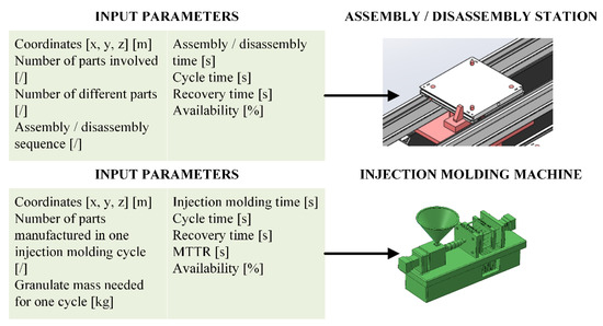 In order to create a digital model, it is necessary to choose only the appropriate parameters, otherwise the system becomes unmanageable [45]. For this reason, the parameters of the building blocks are defined based on the classification of the manufacturing system (as described in Step 1, Figure 3), taking into account the constraints of each building block. Since the focus of our research is the development of a digital model for logistics (i.e., material flow), it is necessary to include the parameters which directly affect the logistics process. Required parameters are process times of operations (e.g., injection, milling, assembly). The times can be recorded via embedded sensors. “Fabrication” building blocks require information about the MTTR (mean time to repair), which is defined as the average time required to repair a failed building block. Although many “Fabrication” building blocks can be found in real manufacturing systems, in this paper we define the parameters for some of them (Figure 5), which are often included in linear assembly lines (the focus of our research).