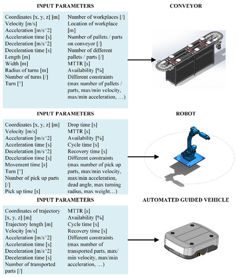 The important parameters for “Handling” building blocks are the coordinates, which determine the location and orientation of the building block in the manufacturing system. Other parameters include velocity, acceleration and deceleration with time, dimensions, the number of parts involved in the process, various timing parameters as well as various constraints (e.g., velocity, acceleration, deceleration, maximum number of parts handled in a cycle, dead angle for robots). For the development of the digital model, it is necessary to take into account the availability and the current status of the building blocks, and in the case of transport of the parts by a machine, the MTTR must also be defined. “Transfer” building blocks require parameters that define the trajectory (to determine the path), path length, the velocity, acceleration and deceleration with time and the cycle time. Another set of parameters includes the number of parts transported in a cycle and various constraints that must be considered during the development of the digital model (e.g., max/min velocity, max/min acceleration and deceleration). Figure 6 shows some examples of “Logistics” building blocks.