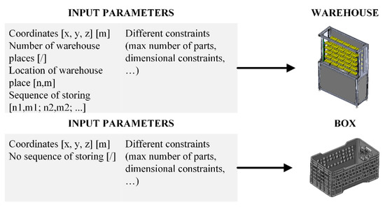 The characteristic of the “Arranged” building block is the order in which the parts are loaded and unloaded. The digital model requires the information about the unoccupied locations and where the next part should be stored. “Arranged” building blocks are limited by both the number of locations and the size of the parts. “Random” building blocks are characterized by the fact that loading and unloading is completely unordered and the parts have no predefined location. The constraints are the volume of the “Random” building block or the maximum allowable weight of the full building block. This information is needed, for example, to determine the time of unloading the stored parts. Figure 7 shows the parameters for an “Arranged” and a “Random” building block.