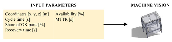 The group of “Inspection” building blocks requires information about the duration of the inspection process (i.e., cycle time) and the estimated percentage of correct parts. If a device is used for inspection (e.g., camera, strength test device), it is also necessary to define the availability of the device and the MTTR. These two parameters are not required if the inspection is performed by an operator. Figure 8 shows a list of parameters for machine vision.