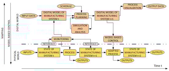 Figure 9 shows the idea of the connection between the physical and digital worlds. The physical world shows the evolution of the manufacturing system through time, as its state changes through the process from “State of manufacturing system at time t” to “State of manufacturing system at time t + 1”. Monitoring these states enables the development of “Digital model of the manufacturing system at time t”. Due to the constant changes in the real system, monitoring must be possible in realtime. That way the model always reflects the actual state of the real system. To make this possible, simulations are performed continuously. The result of the simulation and analysis is “Digital model of the manufacturing system at time t + 1”. This ensures the adaptation of the process of the existing real manufacturing system “State of manufacturing system at time t + 1” to the new form “State of manufacturing system at time t + 2”. Appropriate interfaces are included to connect the digital and physical worlds.