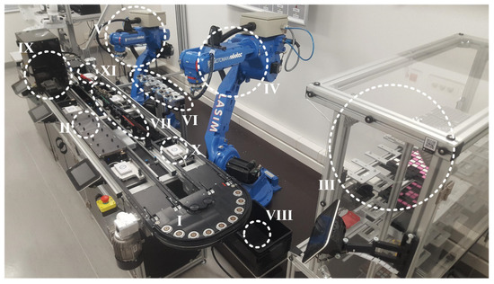The manufacturing system consists of various building blocks (I) a conveyor, (II) four pallets (with RFID tag), (III) a warehouse for base parts and finished products (WBPFP) with 45 locations (4 × 5 locations in the first row and 5 × 5 locations in the second row) where one part of the warehouse stores base parts (first row) and the other part stores finished products (second row), two industrial robots ((IV) Robot 1 and (V) Robot 2) with different payload capacities, (VI) a warehouse for robot grippers (WRG), (VII) three buffers along the conveyor, each containing 64 tiles of the same color (red, green or blue), (VIII) box for faulty finished products, (IX) machine vision, and (X and XI) two automated assembly stations (equipped with RFID reader). Each building block has its own specifications and tasks. The final product is a mosaic assembled into various patterns and colors. Such a product is not used for an industrial case, but it is very suitable for research, as it allows various combinations and thus requires a flexible manufacturing system. In the case study, 12 products (Table 1) in 4 successive scenarios are assembled.