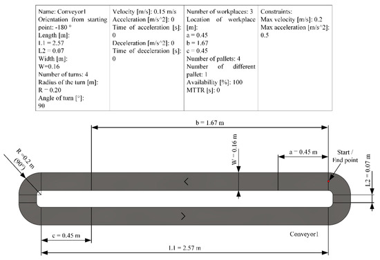 The third step is the development of the digital model of the presented case study. In our case, the Siemens Tecnomatix Plant Simulation 14.2 software package was used to develop the digital model. The development started with the definition of the layout of the manufacturing system with all the building blocks. Each type of a building block requires specific parameters to define it. The defined parameters with their values for the conveyor building block are described in the text below and in Figure 13.