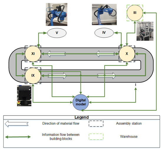 The procedure for digital model development has already been presented several times in the literature [46,47,48]. The most important points will be reviewed here. The procedure is very similar regardless of the software tools used (Siemens Tecnomatix Plant Simulation, Visual Components, Delmia, etc.).