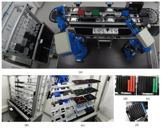 For the remaining two products, the FI algorithm computes the best order sequence and sends the information to the real system. Figure 16b,c show the state in the WBPFP and buffers after all scenarios are completed. The WBPFP with base parts is empty, and there are 11 finished products in the second row. There are still 21 red tiles (Figure 16d), 16 green (Figure 16e) and 7 blue tiles (parts) (Figure 16f) in the buffers.
