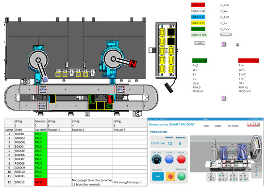 The Figure 17 shows how the digital twin works for the case study. In the fourth scenario, the digital twin lists which products it can assemble (“CAN MAKE” in the green box in Figure 17) and which products it cannot assemble (“CANNOT MAKE” in the red box in Figure 17). The digital twin displays a table with “TRUE” values for products that can be assembled and “FALSE” values for products that cannot be assembled. In the case of Product 12, due to the missing blue tiles, the value “FALSE” and the reason why it cannot be assembled are displayed in the table (lower left side of Figure 17).