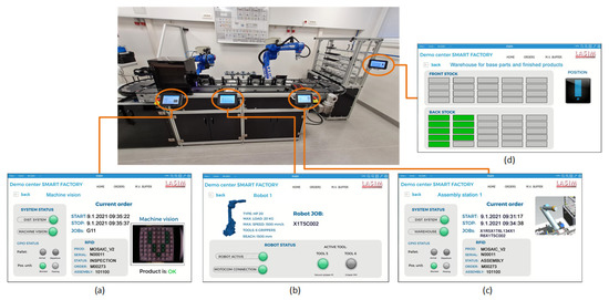 Results are displayed for two participants, an operator and a planner. The operator has four touch screens on which the state of the assembly system can be checked (Figure 18). The visualization shows data from sensors in the real manufacturing system combined with data coming from a digital twin. Figure 18a shows the current machine vision process. The green lights illustrate the correct operation of the device, and red lights appear in case of a malfunction. The display shows the start time, the end time and the information about the correctness of the product; there are two states: “Product is OK” or “Product is NOK”. The green lights in Figure 18b,c show the same information as described in Figure 18a. Figure 18d shows the state of the WBPFP. The green rectangles show the position of the finished products in the second row of the WBPFP. Using the digital twin, the operator can check the number of tiles, base parts, and finished products in the buffers or in the warehouse and determine the optimal loading/unloading time.