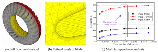 A mesh independence test was performed with different mesh resolutions, the reference pressure level was 0.4 MPa, and the pump speed was 2000 rpm, SR was 0.4. Figure 3 shows the torque results of pump, turbine and stator over variant mesh densities through the CFD calculation. Taking into account the computational efficiency and accuracy comprehensively, the element numbers of pump, turbine and stator are 7,538,148; 4,319,448; and 2,442,091 respectively, and the torque variation of pump, turbine and stator is 1.63%, 1.42%, and 1.90% respectively, which satisfies the requirement of mesh independence, as shown in Table 1, and the bold font is the final chose mesh model.