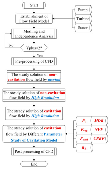 The parameter study on torque converter cavitation is carried out according to the flow chart shown in Figure 4. The internal flow of torque converter is three-dimensional, viscous and turbulent. The full flow model of torque converter was firstly established and then the meshing and mesh independence analysis were carried out, the mesh around the blade surface was refined and its Yplus should be less than 2.