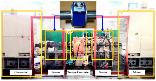 The test cell consists of a motor (300 kW) and a generator (300 kW) to simulate various speed conditions. The speed and torque sensors of Sensor Technology Ltd., with calibration accuracy of 0.25%, are installed at the input and output ends of the torque converter respectively, the maximum range is 5000 rpm and 2000 Nm respectively. Besides, the pressure and flow in the torque converter was supplied by a hydraulic system. The test speed ratio is realized by controlling the speed of motors (NP = 2000 rpm) and generator (NT = 0–1600 rpm) during the experiment, and the internal liquid pressure (Pc = 0.4 MPa) and temperature (TC = 90 °C) are realized by controlling the hydraulic system, as shown in Figure 5.