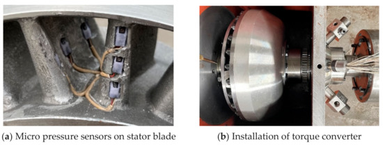 Based on the torque converter test cell, the pressure sensors were integrated into stator blades to obtain the pressure information of flow field and cavitation in the torque converter, as shown in Figure 6. The micro pressure test data in torque converter will support and verify the modification of cavitation model parameters.