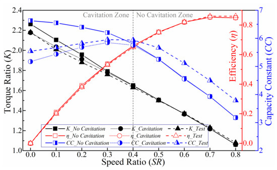 Comparison of torque ratio, efficiency, and capacity constant between no cavitation, cavitation, and test at various speed ratio under cavitating and non cavitating conditions.