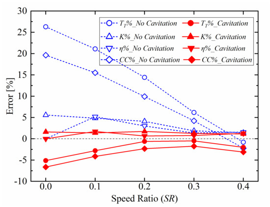 Error comparison of turbine torque, torque ratio, efficiency, and capacity constant between no cavitation and cavitation at various speed ratio under cavitating conditions.