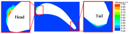 The oil vapor volume fraction distribution in stator domain as shown in Figure 10, we found that cavitation mainly occurs at the leading edge of stator suction surface and the trailing edge of pressure surface. However, the cavitation near the blade tail is very small compared with that near the head, which is not convenient for observation and comparative analysis. Therefore, we focus on the cavitation of stator blade head.