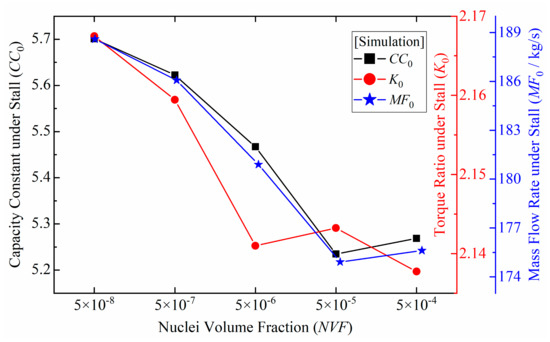 The performance of torque converter under various NVF is shown in Figure 11. It is clear that nuclei volume fraction has a great influence on the performance of the torque converter. The capacity constant, torque ratio and mass flow rate decrease with an increasing NVF when NVF ≤ 5 × 10−5. NVF exhibits limited influence on the overall performance when NVF exceeds 5 × 10−5.