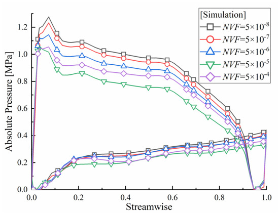 The absolute pressure distribution diagram of the middle streamline on stator blade surface (Figure 12) shows that there is a big differential pressure between the suction surface and pressure surface of stator blade, which decreases gradually from head to tail, the differential pressure makes torque converter play a role in transmitting torque. In addition, the pressure decreases drastically on the pressure surface of stator blade with an increasing NVF, and the pressure change near the head is more obvious, while it decreases slightly on the suction surface, which leads to the reduction of mass flow rate, capacity constant and torque ratio. However, there are also some errors caused by calculation and streamline selection (such as the high value of NVF = 5 × 10−4).