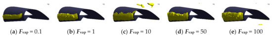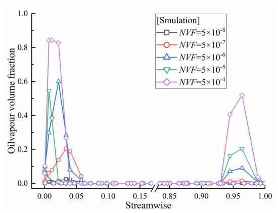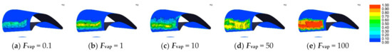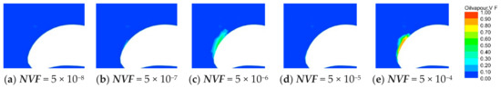 Figure 15 and Figure 16 show the 10% vapor volume fraction distribution in the stator domain and the oil vapor volume fraction distribution on the stator blades under various NVF. We ignored the trend error caused by blade selection and found, the volume of oil vapor bubbles at the head of stator blade gradually increases with an increasing NVF, and covers the entire head of the stator blade when NVF is greater than 5 × 10−6. The oil vapor volume fraction on the surface of blade exhibits an increasing trend, the area with high oil vapor volume fraction gradually expands as the NVF increases.