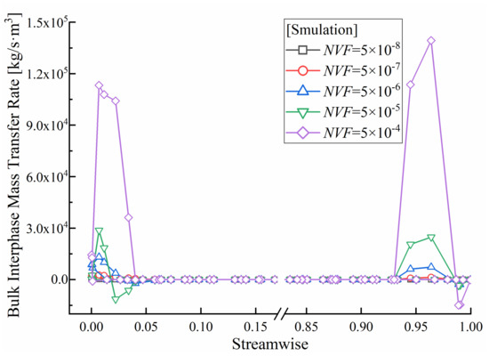 Bulk interphase mass transfer rate on stator blade at stall under various nuclei volume fractions.