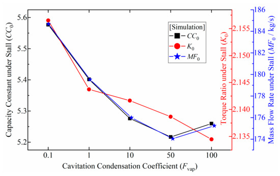The error comparison of turbine torque, torque ratio, efficiency and capacity constant between no cavitation and cavitation at various speed ratio under cavitating conditions is shown in Figure 8. It can be concluded that the error reaches the maximum under stall when cavitation was ignored, and the maximum capacity constant error was reduced from 19.6% to 6.7% by considering cavitation (Figure 8). However, a higher accuracy model could be achieved if proper empirical coefficients were adopted. Therefore, we studied the influence of empirical parameters to reveal the influence of the model parameters on the cavitation performance and flow state and optimized the cavitation model for torque converter cavitation simulation.