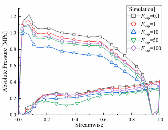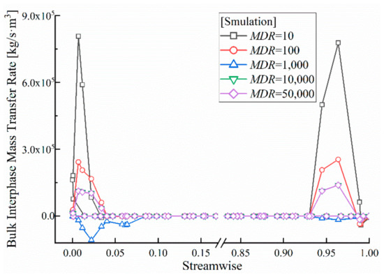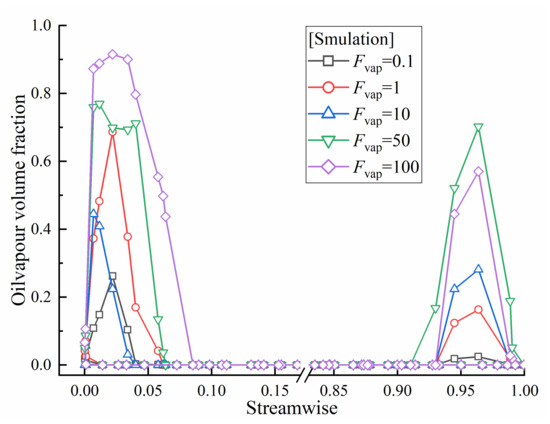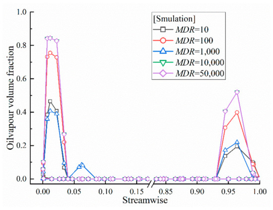 Figure 33 and Figure 34 show the oil vapor volume fraction and the bulk interphase mass transfer rate on the middle streamline of stator blade under various MDR. The results show that the oil vapor volume fraction increases gradually with the increase of Fvap, while the mass transfer rate decreases with the increase of Fvap. There is little variation in both volume fraction and interphase mass transfer rate when MDR ≥ 10,000.