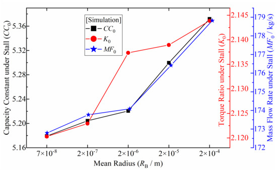 Capacity constant, torque ratio, and mass flow rate of torque converter at stall under various nuclei volume fractions.