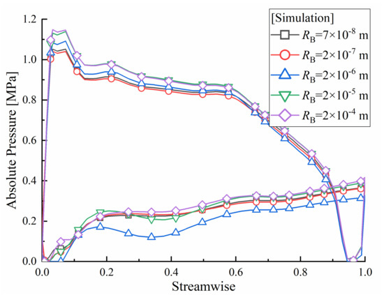 The maximum influencing parameter—NVF—was modified to 5 × 10−5 to correct the over-prediction of cavitation by the original cavitation model parameters, which can significantly reduce the volume of cavitation bubbles and the oil vapor volume fraction. Besides, we modified RB to 2 × 10−5 m which can reduce the rapid growth and collapse of bubbles caused by the excessive initial bubble radius. Fvap was modified to 20 due to the vaporization degree and vaporization rate of viscous oil are less than that of water.