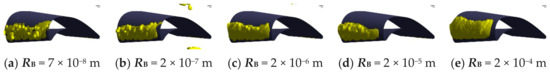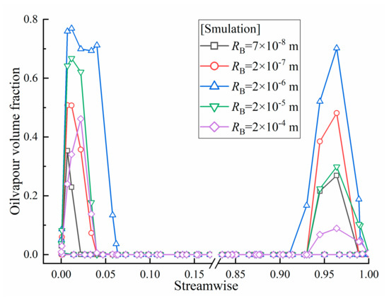 The oilvapor volume fraction distribution in stator domain under various RB is shown in Figure 30. With the increase of RB, the length and the volume of bubbles increases. However, when RB =2 × 10−4 m, the oilvapor volume fraction decreases in spite of an increasing bubble length and volume. The reason is that it is easier for bubbles to grow when the radius of the gas core is bigger, which increases the bubble volume.