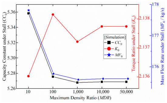 Capacity constant, torque ratio, and mass flow rate of torque converter at stall under various maximum density ratios.