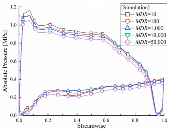 The absolute pressure distribution diagram of the middle streamline on stator blade surface (Figure 32) shows that with the increase of MDR, the pressure on pressure surface decreases, but it has little change on suction surface, which leads to the reduction of mass flow rate and capacity constant. It is worth noting that the absolute pressure distribution remains unchanged when MDR is greater than 10,000.