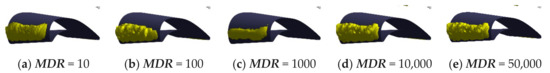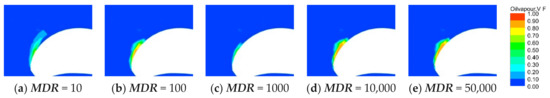 We found out that the volume and the length of bubbles in the blade head did not change much with the increase of MDR; however, the oil vapor volume fraction increases gradually (Figure 36). The results reveal that the maximum density ratio has little effect on the volume and the distribution of bubbles, but it will affect the oil vapor content per unit volume, i.e., the vapor density. In conclusion, cavitation becomes more serious with the increase of MDR, it is worth mentioning that the calculation results will no longer change when MDR ≥ 10,000.