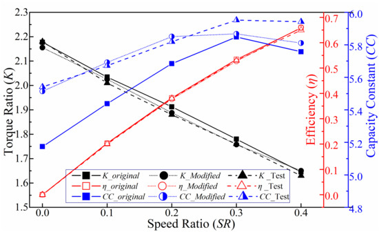 Comparison of torque ratio, efficiency, and capacity constant between the original model and modified model and test at various speed ratios under cavitating conditions.