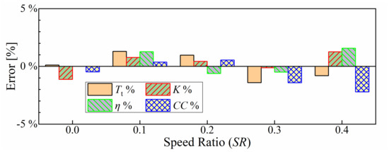 Errors of turbine torque, torque ratio, efficiency, and capacity constant between modified cavitation model and test at various speed ratio under cavitating conditions.