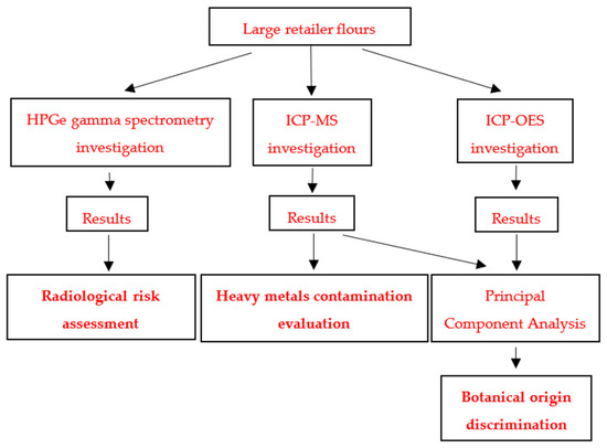 Flour investigation, in terms of physical and chemical pollutants and mineral content, is of great interest, in view of its high consumption for nutritional purposes. In this study, eleven types of flour (five samples for each one), coming from large retailers and employed by people for different cooking food purposes, were investigated through high-purity germanium (HPGe) gamma spectrometry, in order to estimate natural (40K) and anthropogenic (137Cs) radioisotope specific activity and thus, to assess the radiological risk due to the flour ingestion. Inductively-coupled plasma mass spectrometry (ICP-MS) and inductively-coupled plasma emission spectroscopy (ICP-OES) were also employed to evaluate any possible heavy metal contamination and the mineral composition, and to perform multivariate statistical analysis to deduce the flour authenticity. The evaluation of dose levels due to flour ingestion was performed, for the age category higher than 17 years, taking into account the average yearly consumption in Italy and assuming this need to be satisfied from a single type of flour as a precaution. All obtained results are under the allowable level set by Italian legislation (1 mSv y−1), thus excluding the risk of ionizing radiation effects on humans. As far as heavy metal contamination is concerned, Cd and Pb concentrations turned out to be lower than the threshold values, thus excluding their presence as pollutants. Finally, the multivariate statistical analysis allowed to unambiguously correlate flour samples to their botanical origin, according to their elemental concentrations.
