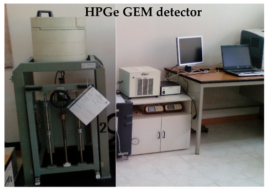 For the gamma spectrometry investigations, samples were packed in a 20 mL polyethylene plastic vial to reach a geometry homogeneity around the detector; then, the respective net weights were measured and recorded. After this preparation step, they were counted for 70,000 s, and spectra were analyzed in order to obtain the activity concentration of 137Cs and 40K, through the evaluation of their γ-lines at 661.66 keV and 1460.81 keV, respectively. A positively-biased Ortec HPGe detector (GEM) (FWHM of 1.85 keV; peak-to-Compton ratio of 64:1; relative efficiency of 40% at the 1.33 MeV 60Co γ-line), placed inside lead wells to shield the background radiation environment, was employed for the analysis. A photo of the experimental setup is reported in Figure 2.