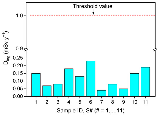 Table 3 reports the estimation of the annual effective dose due to the ingestion of investigated samples, Ding, as calculated by Equation (2), for the age category higher than 17 years.