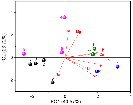 The groups appear to be comparable to each other in terms of macro- and micro- element concentration. Specifically, four groups were recognized: group I (containing samples S10 and S11, green points) and IV (containing samples S1 and S8, blue points) refer to flours that turned out to be positively correlated, as far as PC1 is concerned, with Ca, Mg, P, Cu, Zn, Fe, Ni, and Mn, and negatively correlated with Na. Regarding PC2, flours in group I exhibited a positive correlation with values of Cu, P, Mg, and Ca contents, and a negative correlation with other variables. The opposite occurred for flours in group IV. Continuing on, group II (containing samples S4, S5, and S9, purple points) and III (containing samples S2, S3, S6, and S7, black points) refers to flours that turned out to be negatively correlated, as far as PC1 is concerned, with Ca, Mg, P, Cu, Zn, Fe, Ni, and Mn, and positively correlated with Na. Regarding PC2, flours in group II exhibited a positive correlation with the values of the Cu, P, Mg, and Ca contents, and a negative correlation with other variables. The opposite occurs for flours in group III.