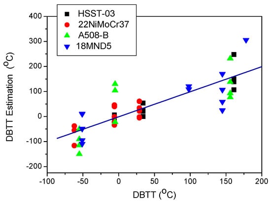 Estimated DBTT values as functions of the measured DBTT values for the investigated three base metals, 22NiMoCr37, A508-B, and HSST-03, and for one weld metal, 18MND5-W [11].