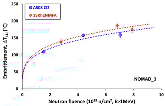 Magnetic measurements and mechanical tests were performed on the same samples before and after neutron irradiaton. As has been reported presently [13], irradiaton caused measurable changes in the material properties. The correlation between the transition temperature and neutron fluence is not linear: relatively low neutron dosage causes a relatively large increase of ΔDBBT, as shown in Figure 2 (or ΔT41J in the Figure), and later, a larger dosage causes smaller changes in material embrittlement due to the accumulation of the induced damages. The sample series 15Kh2NMFA in Figure 2 is the same as was measured in the present work.