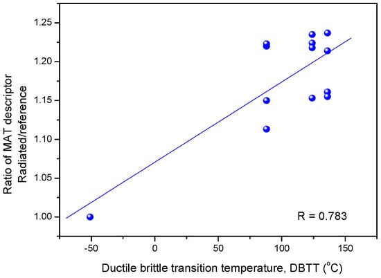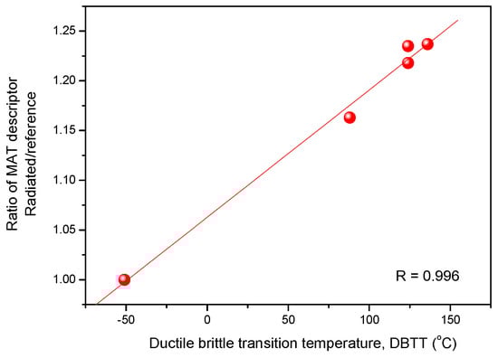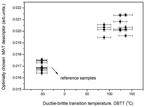 To clarify that we did not use backward reasoning to decide which data points fit best to our hypothesis, we shall briefly detail the process: (1) We observed a large scatter of MAT descriptors (see Figure 6) measured on the reference and irradiated samples. (2) Regardless of the result of the MAT evaluation, we compared the magnetic behaviour of reference samples, and it was found that there were four samples that behaved similarly from a magnetic point if view. (3) The MAT evaluation was repeated, taking into account only the selected samples. This selection did not give any information about the behaviour of the irradiated samples; by taking this selection, we did not know how the irradiated samples would behave.